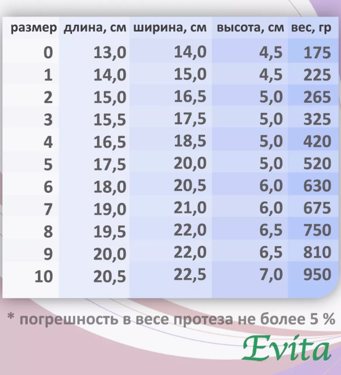 - Мысленно проведите линию влево и определите какой экзопротез соответствует вашему размеру белья.