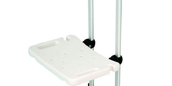 Складной табурет для душа выполнен в виде пластмассового сиденья и двух металлических полозьев, предназначенных для регулировки высоты сиденья. Фиксация высоты осуществляется при откидывании сиденья.